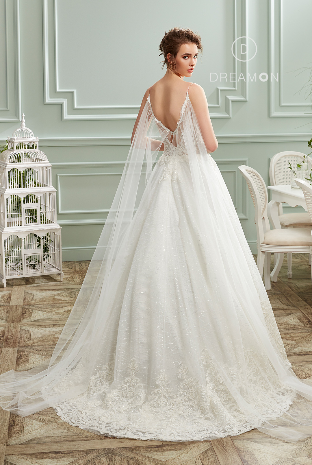 Derin sırt dekoltesiyle ön plana çıkan A Kesim Gelinlik modeline tülden pelerin detayı eklenmesi dikkat çekmektedir.