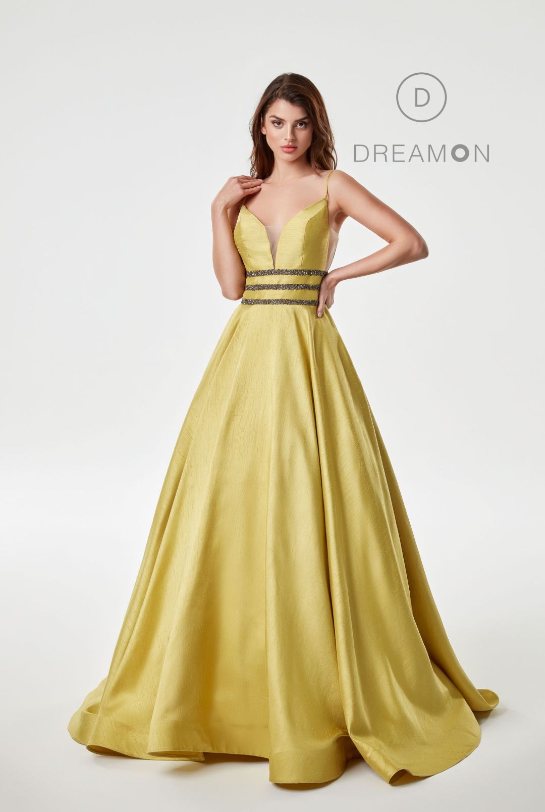 Tamamı saten kumaştan hazırlanan abiye modelinde el işleme kemer detayı ön plana çıkmaktadır.