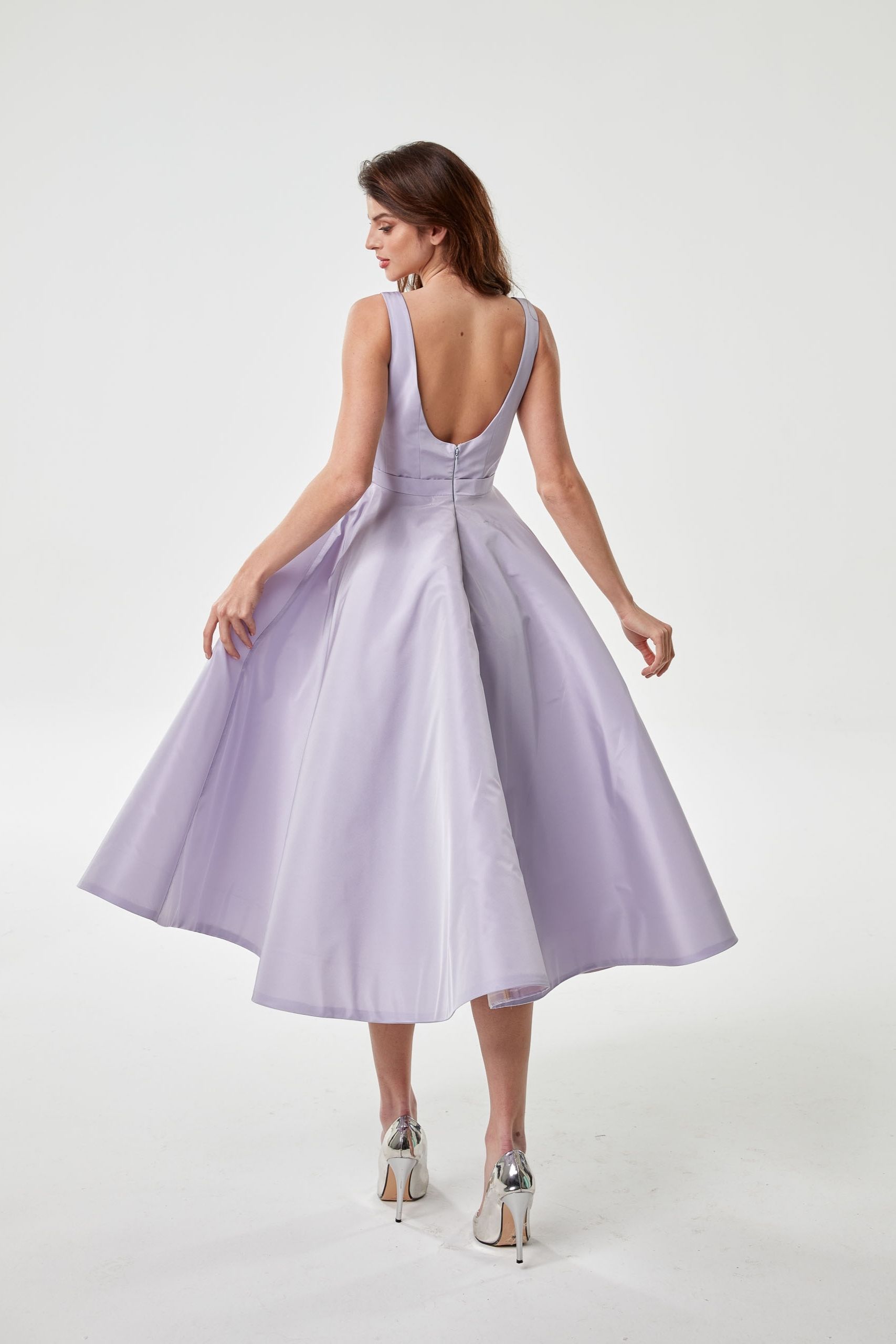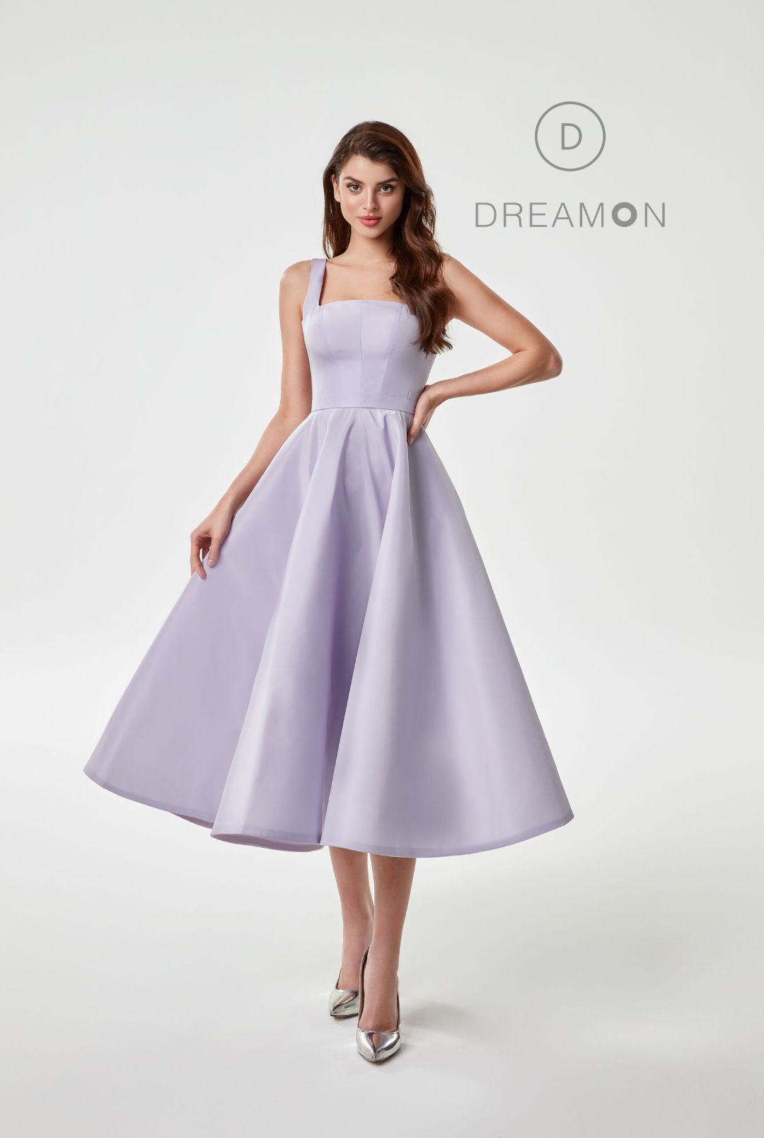Saten tafta kumaştan hazırlanan midi abiye modeli, sandık yaka olarak tasarlanmıştır.